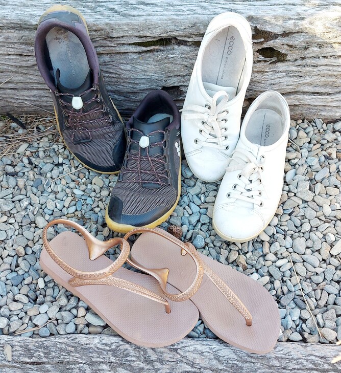 Comfortable, easy-to-clean shoes like sneakers, flip flops/sandals, and hiking boots.